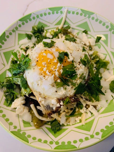 2nd crisp up the chorizo in a skillet, and prep your toppings crumbling the queso fresco, slicing some avocado, chopping some white onion & cilantro. in another skillet pour a generous amount of salsa verde and heat on low. once the chorizo is crisped & drained set aside. next add some of your tortilla chips to the salsa verde, gently mixing some of them in but also leaving some of them crispy. in the other skillet fry a sunny egg, so the yolk is nice runny.